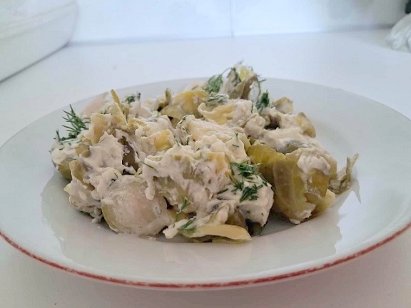 Продукти (за 2 порции): брюкселско зеле – 500-600 г, заквасена сметана – 200 г, синьо сирене или пармесан – 80-100 г, масло – 50 г, копър.