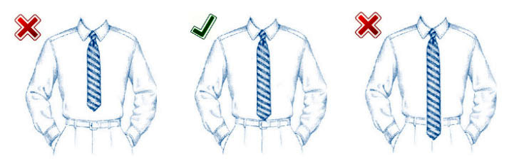 Върхът на вратовръзката ви може да докосне върха на катарамата на колана ви, но никога не трябва да слиза по-надолу или да се качва нагоре.