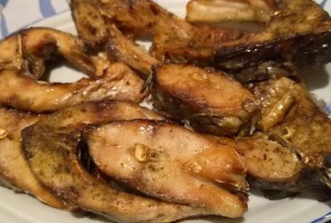 В тавичка се нарежда почистеният и нарязан на едри парчета шаран.