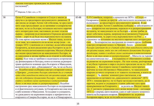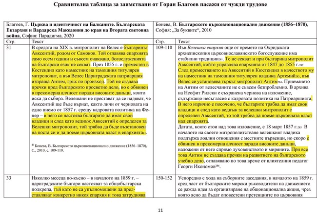 “В текста на Благоев са налице и фактологични неточности заради прилаганото от него механично разместване на пасажи от чуждия текст”, пише още проф. Събев в рецензията си. И още: “Според международните академични стандарти това е retweet plagiarism - авторът цитира заглавието на определен източник, но написаното от него е много сходно по думи, строеж на изреченията и граматични форми с оригиналното съдържание”. Според проф. Събев книгата на Благоев не отговаря на тези критерии за труд, с който да кандидатства за доцент. Освен това нямало изследователски подход, анализ и конкретно изложени и аргументирани тези на автора или хипотези. Липсвали и заключителна част с резултати, изводи и приносите на изследването. За да докаже тезата си, проф. Събев е приложил и 20 страници с пасажи от книгата на Горан Благоев и ги е сравнил с тези на оригиналните автори. Еднаквите текстове са оцветени в жълто. От таблицата става ясно, че най-много е ползвана книгата “Българското църковнонационално движение (1856–1870)” на проф. Вера Бонева, но и други историци и учени. В реценцията на проф. Събев е посочено, че от богатия фонд на Българската екзархия Благоев е цитирал само една архивна единица, и то по онлайн публикация. В заключение професорът казва, че Горан Благоев не е подходящ за академичната длъжност доцент в БАН. Освен това от чуждите езици владеел на добро ниво само руски, а познанията му по английски, френски и балкански езици били на основно ниво.