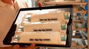 Лъжица захар помага за "преглъщане на лекарството" в пекарна в град Дортмунд, Германия, която отбелязва годината на коронавирусната ваксина с торти с формата на спринцовки, предадоха световните агенции.