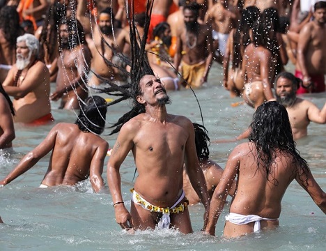 Аскети Нага садху, покрити с пепел, носещи саби и тризъбци, поведоха къпещите се в северния град Харидвар за фестивала за духовно пречистване Кумбх Мела, който продължава до края на април.