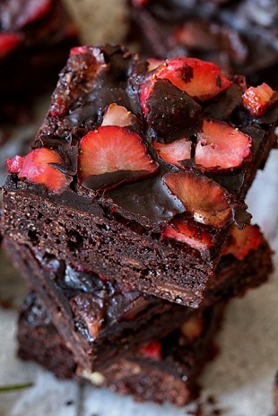 Приготвяне: Шоколадът се разтопява на водна баня и се смесва с маслото. Оставя се да се охлади на стайна температура. Отделно се разбъркават добре яйцата и захарта, добавят се брашното и бакпулверът. Шоколадовата смес се прибавя към яйчената и печете в предварително загрята на 180 градуса фурна в продължение на 25 минути. Тавата за печене е застлана с хартия за печене. След охлаждане на сладкиша се залива с разтопения шоколад и маслото, в който са сложени нарязаните на ситно ягоди. След около час ягодовото брауни ще се е стегнало достатъчно и е готово за разрязване и сервиране.