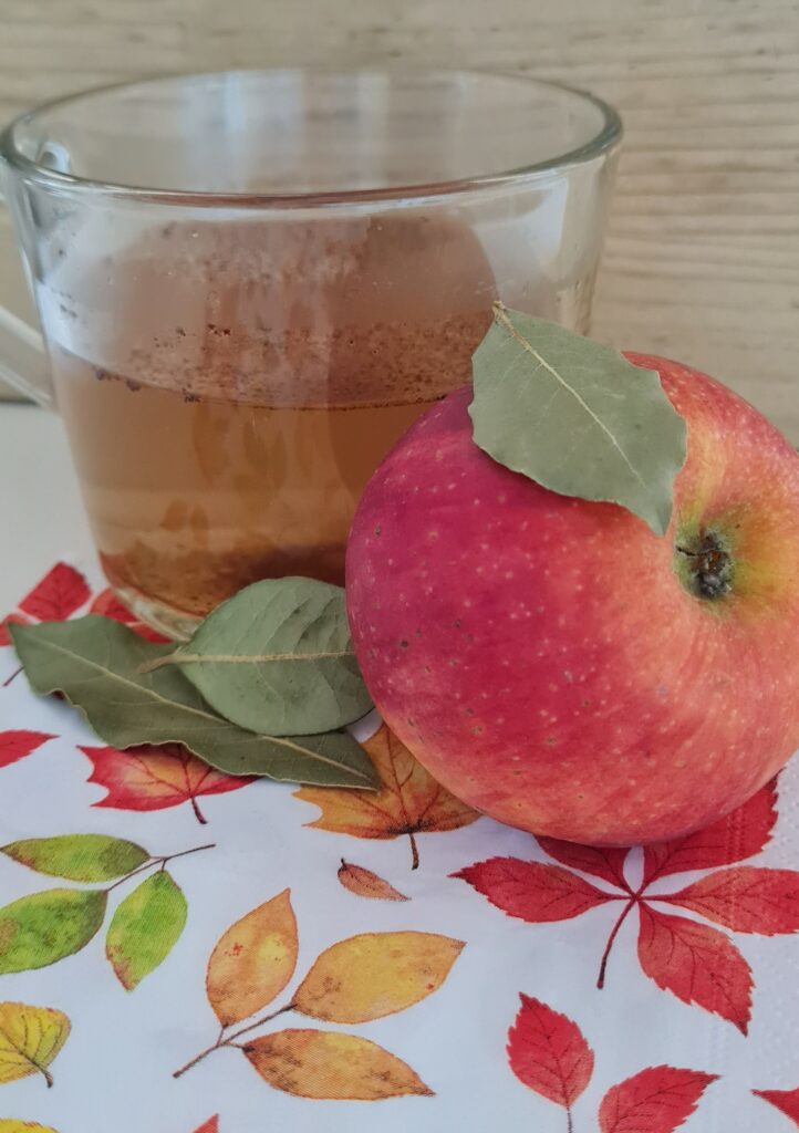 Необходими съставки: 3 изсушени дафинови листа,1 ябълка,1 л вода ако искате може да си добавите канела и мед.
