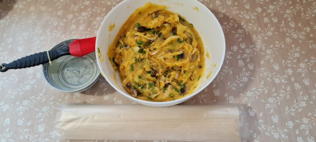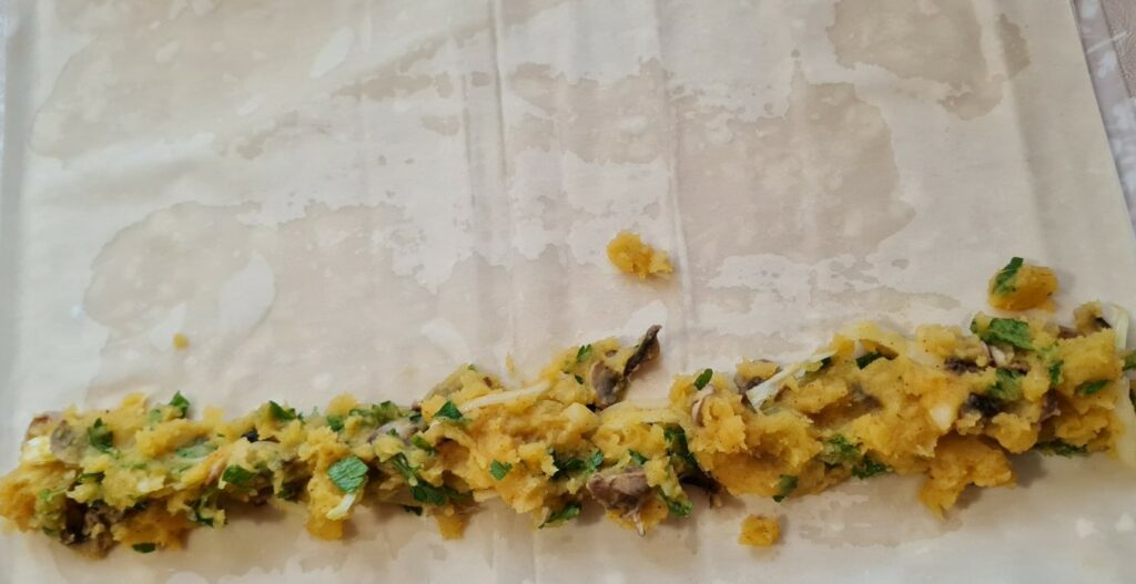 Почваме да редим корите, като първата мажем с водата и мазнината а на втората слагаме от плънката и завиваме. Така процедираме с всички кори.