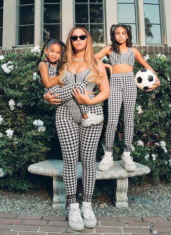 На тях 40-годишната певица е с двете си дъщери Руми и Блу Айви, те са обути в хармонични комбинации от дългоочакваната колекция.