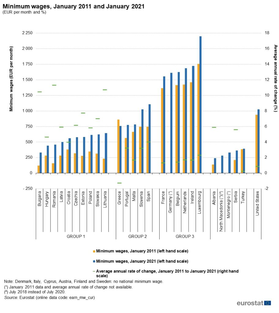Данните на Евростат показват още, че между 2011 и 2021 година най-голям скок на размера на минималното възнаграждение има в Румъния - от 11,3%. След нея са Литва и България със съответно 10,7 и 10,4 на сто. „Трудът е най-добрият начин за борба срещу бедността“ не се прилага за нископлатените сектори, както и за тези, които работят при несигурни и нетипични условия на труд.