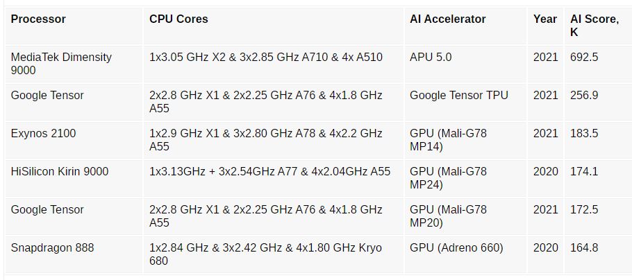 Новият чип на Медия Тек - Dimensity 9000 е един от най-чаканите чипове през 2022 г. Чипът е направен по 4 нано-милиметрова технология от TSMC. Очаква се чипът да влезе в пряк двубой със следващото поколение мобилни чипове предлагани от Самсунг и Qualcomm. Резултатите качени в базата данни на Al Benchmark показват, че Dimencity 9000 отвява конкуренцията на Гугъл Тенсор, както и Exynos 2100 почти двойно. Вижте бенчмарка по-долу.