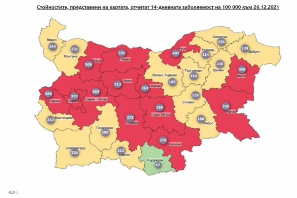 В същото време област Ямбол преминава от жълтата в червената зона. Общият ръст на заболеваемостта за страната за последните 7 дни е 50%, но няма области с рекордна дневна заболеваемост на 14-дневна база.