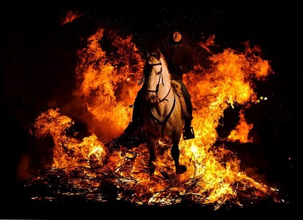 В деня на Св. Антоний - покровител на животните - в Испания е обичайно да се возят коне чрез огньове и да благословите техните домашни любимци, за да направят тази година щастлива и спокойна за тях..