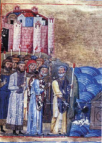 Като узна за него римският папа, прати да го повикат. И когато той дойде в Рим, самият папа Адриан излезе да го посрещне с всички граждани, със свещи в ръце, понеже носеше мощите на свети Климент, мъченик и папа римски. И заради него Бог незабавно направи тук преславни чудеса: разслаблен човек се излекува и мнозина други се изцериха от различни недъзи; също и пленниците, които призоваха [името на] Христа и на свети Климента, се освободиха от ръцете на ония, които ги бяха пленили.