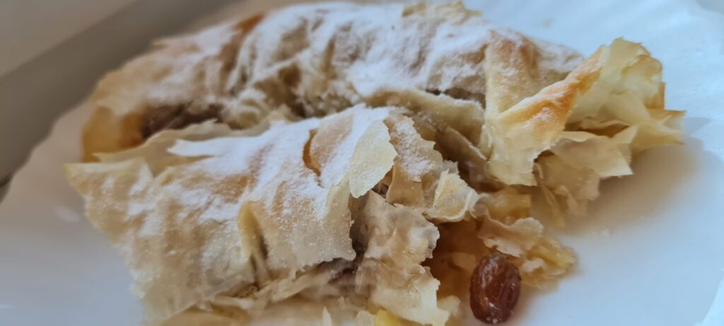 Върху втората кора се разпределя настъргана ябълка и тук-там нареждаме стафиди и двете кори се навиват на руло от дългата страна.