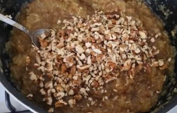 Сложете на котлона настърганите ябълки, орехите и кокосовото масло (леко затоплете).