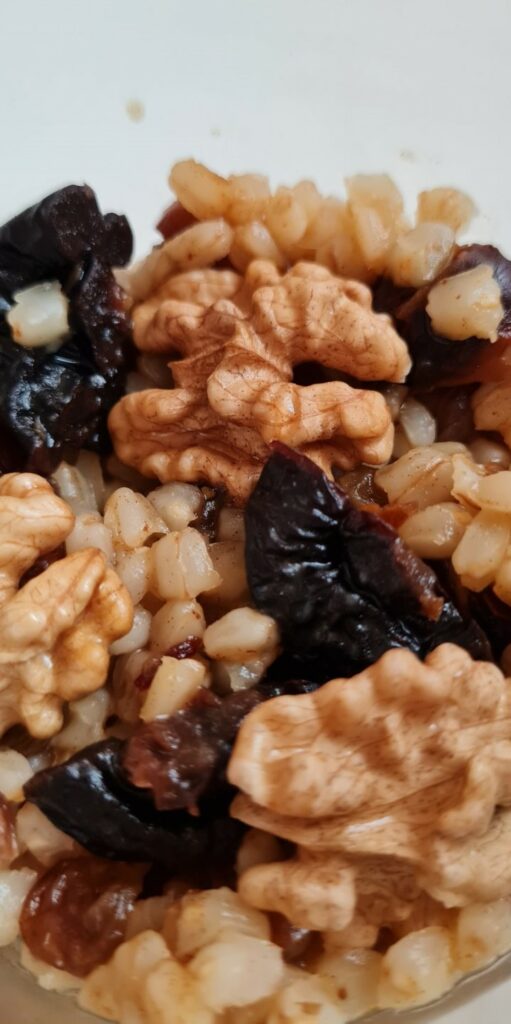Когато житото е готово, отместете от котлона. Добавяте сушените плодове, които предварително нарежете на дребно (аз предварително ги накисвам във млака вода). Стафидите оставете цели. Подсладете по ваш вкус. Прибавете 1/2 чаена лъжичка канела.