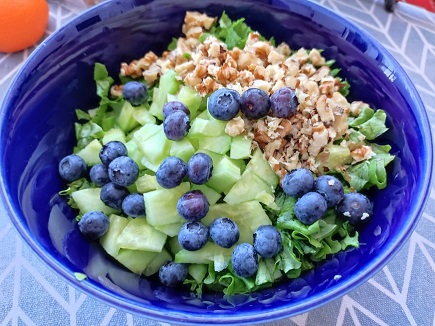 Продукти: половин маруля, боровинки – 2-3 супени лъжици, краставица – 1 брой, ядки – 2-3 лъжици, кисел мляко – 3 супени лъжици, сол – на вкус, олио или зехтин – 2 супени лъжици.
