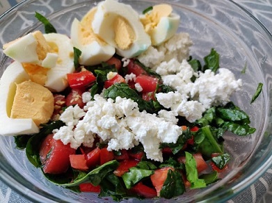 Продукти: 150-200 г спанак бейби, две сварени яйца, една малка или половин голяма червена чушка, една краставица, един голям домат или два големи, черен пипер – на вкус, сол – на вкус, олио – 2 супери лъжици, сок от половин лимон, сирене – 150 – 200 г.