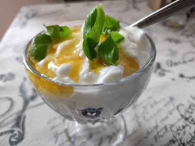 Приготвяне: Ако ползвате боровинки, малини, къпини или други дребни горски плодове, най-напред ги измийте. Ако плодовете са по-едри, също ги измийте, обелете и нарежете на ситно. Поставете ги в дъното на индивидуална чаша или купичка за сервиране на десерт. Отгоре сложете 2 до 2 ½ супени лъжици кисело мляко, сметана или извара, според предпочитанията. Залейте с меда, по желание посипете с ядки. Украсете с листенца от босилек или мента.
