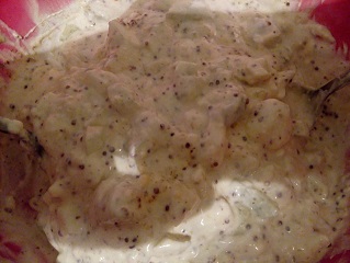 Продукти: яйца сварени – 4 бр., натрошено бяло сирене – 4 супени лъжици, прясна краставица – 1 брой, майонеза – 100 г, кисело мляко – 2 супени лъжици, горчица – 1 ½ до 2 супени лъжици.