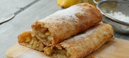 Приготвяне: Ябълките са изчистват и нарязват на малки късчета. Добавя се захарта и канелата, разбърква се. Задушават се със захарта докато станат меки. Изстиват и се влагат в тестените „пликчета”.