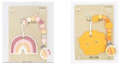 Забранени за продажба са и два модела бебешки чесалки за зъби с номера BBOPE-12-P и BBOPE-21-L на бранда Danbar и отново с произход Китай. Опасността при тях е, че верижката може да се разпадне на малки части и при поглъщане от детето да предизвика задушаване. Артикулите са изтеглени от пазара и от крайните потребители.