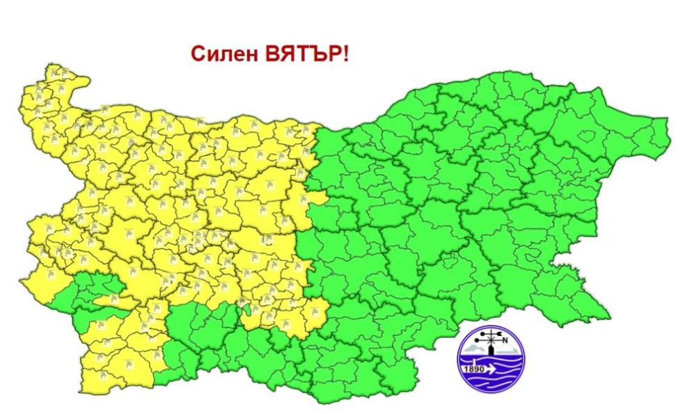Жълт код обявиха от Националния институт по метеорология и хидрология (НИМХ). Предупреждението е за силен северозападен вятър със средна скорост от 14-19 метра в секунда, на места и с пориви до 21-24 метра в секунда, важи за 13 области от страната. Това са Видин, Монтана, Враца, Плевен, Ловеч, Габрово, Пловдив, Пазарджик, София-област, София-град, Монтана, Перник и Благоевград.