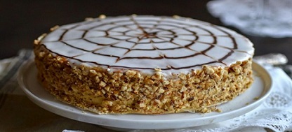 Ореховата торта „Екстерхази” украсете със сладко и шоколад, като не забравяте да оформите мрежичка – отличителният белег на този сладкиш.