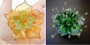 Гърлото на бутилките се отрязва. Всяко гърло се реже в дълбочина, но не до края. Оформят се 6 ивици, които се огъват. Краищата се опалват със запалената свещ – най-напред по края, за да са красиви и равни. Оформят се според собственото виждане. За тичинките използвайте тънка тел, на която можете да нанижете маниста. Всичко това оформете и прикрепете едно към друг с лепило. При необходимост използвайте смело шилото.