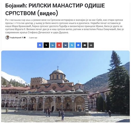 „След битката при Велбъжд през 1330 г., водена от сръбския генерал Стефан Дечански, Рилският манастир става част от сръбската държава“, пише Боянич на своя уебсайт.