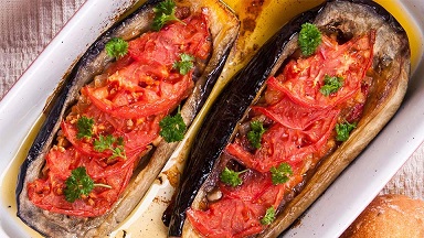 Приготвяне: Почистваме патладжаните от дръжките и ги обелваме от кората им на ивици по дължина. След това ги нарязваме пак по дължина на кръст, като оставяме от единия край поне 2 см. неразрязани, за да не се раздели синия домат на части. Посолваме ги и ги оставяме да престоят 3-4 часа. Преди да ги сготвим, измиваме патладжаните отново, за да отстраним излишната сол и отново ги оставяме да се отцедят добре. В подходящ за пържене съд наливаме по-голямата част от олиото и след като то се сгорещи , пържим патладжаните от всички страни равномерно до порозовяване, като ги обръщаме внимателно. Ако преди това не сме го изцедили добре, влагата, останала в тях може да ни създаде проблемис кипящата мазнина. Нарязваме на ситно чесъна и кромида и го запърржваме на слаб огън. Когато лукът придобие златист цвят , наливаме чаша вода, добавяме смлените домати и подправките и усилваме огъня. Когато съдържащото се в тавата кипне, го всаляме от огъня и с помощта на дълбок черпак го разстиламе равномерно върху подредените в тава патладжани, така че напълно да ги покрием. Поръсваме ястието с нарязаните на дребно магданоз, мента и босилек и слагаме да се пече в предварително загрята до 250 градуса фурна.