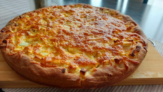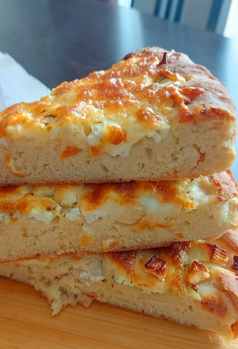 Замесва се тесто, като постепенно се добавя 1-2 супени лъжици олио, за да не лепне. Оставя се да си почине 30-50 мин. Тавичка се намазва с масло, а тестото се разстила, за да стане като пица. Дупчи се с вилица. Отгоре се слага сирене, нарязано на кубчена и микс от подправки. Добавят се миниатюрни парченца масло. Преди пълното изпичане, около 5-10 минути преди него, може да се настърже кашкавал, да се сложат нарязани маслини или чери доматчета. Тук изпровизацията е напълно в ръцете на домакинята. Цялото печене отнема не повече от 25-30 минути на 180 градуса.
