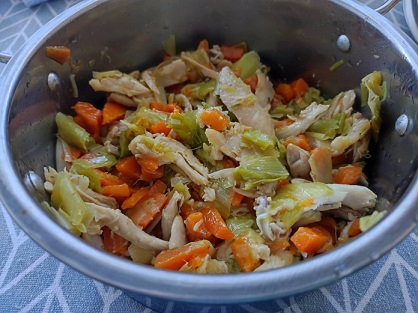 Приготвяне: Пилешкотомесо се изпича с малко олио и вода. Обезкостява се. Отделно се задушават в олио нарязаните на лентички моркови за около 10 минути. Прибавя се нарязания на кръгчета праз. Когато се задуши, се добавят солта и подправките. Нарязаните парченца пилешко месо се прибавят към зеленчуковата смес и се разбърква. Поднесете топло.