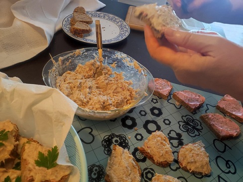 Приготвяне на пастета: Рибата се обезкостява и парчетата се нарязват ситно. Прибавя се ситно нарязаният лук и сокът на лимона. Следващият компонент към сместа е майонезата. Разбърква се.