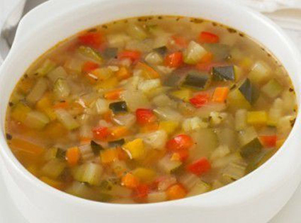 След това ги нарязваме. Рязането да става с нож, а не с блендер, тъй като вкусът ще бъде съвсем различен, понеже блендерът не само реже, но и деформира съставките. Освен листата на целината, магданоза и копъра, всички останали зеленчуци трябва да се нарежат на много дребни кубчета. Наливаме в тенджерата три литра вода и щом кипне, слагаме в нея всичките наситнени зеленчуци. Оставяме ги достатъчно време да се варят, докато омекнат и тогава прибавяме зехтина, нарязаните на ситно магданоз и копър, както и подправките. Варим още малко. Една минута преди да свалим тенджерата от огъня, прибавяме лимоновия сок. Тази супа е много вкусна, а освен това се приготвя много бързо и лесно. В зависимост от това колко гъста супа искаме да получим, наливаме и съответното количество вода по време на варенето. Това ястие може да се приготви и съвсем постно, без да се употребява каквато и да е растителна мазнина.