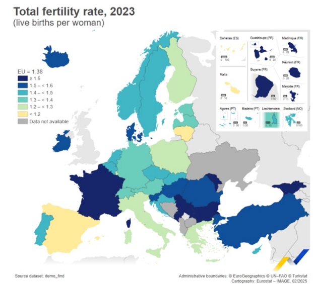 Това е рекордно равнище за страната ни от 1990 г. насам, показват публикуваните данни на европейската статистическа агенция. Най-ниски нива през 2023 г. са отчетени в Малта (1,06 раждания на жена), Испания (1,12) и Литва (1,18). В същата година в ЕС са се родили 3,67 милиона бебета, което представлява спад от 5,4% спрямо 3,88 милиона през 2022-ра. Това е най-големият годишен спад на европейско ниво, регистриран от 1961 г. насам.