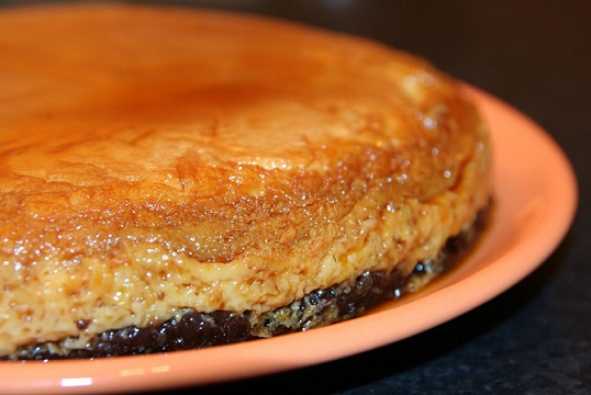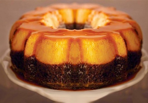 По-нататъшно приготвяне: във формата, в която е карамелът се налива масата за крема. Отгоре се налива тестото. В дълбока форма се налива гореща вода, в нея се слага формата със съставките. Пече се в предварително нагрята фурна до 160 градуса около 40-50 минути. Оставя се за изстине във формата. Поставя се в хладилника за 8-10 часа. Преобръща се в голяма чиния и се поднася. Да ви е сладко!