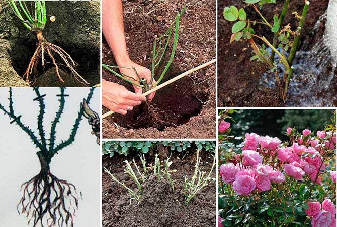 Опитните градинари препоръчват саденето на рози да стане на склон в градината, като бъдат разположени така, че през деня да имат частична сянка. Това е важно, за да не изгорят листенцата им от лъчите на слънцето.  Ямата за засаждане да е дълбока около 60 см. Препоръчват се няколко вида почва или обогатен материал, който ще насипете около корените. Единият вариант е да направите смес от 2 кофи градинска почва, една кофа хумус, пясък и глина. Добавете 150 g суперфосфат или костно брашно. Другият е 10 части пръст и една част угнил оборски тор. Можете да използвате специални субстрати. Прилагането на хумус трябва да бъде добре пресметнато. Пресният оборски тор може да причини изгаряния на корените на растенията. При мокро засаждане е необходимо да изсипете много вода в дупката. Почвата  трябва да стане на каша. Разсадът се поставя във влажна почва и се поръсва с пръст. Заради този метод на засаждане, почвата може леко да провисне, в който случай е необходимо да я насипете внимателно, без да тъпчете. След саденето внимавайте със затрупването. То играе ключова роля, тъй като през пролетта все още могат да дойдат студове, които ще повредят растенията. Затрупването се извършва с 15-20 сантиметра. Около средата на май можете да изравните почвата, тогава розата ще се развива спокойно.