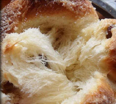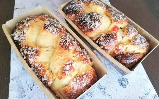 Оставя се да втаса на топло два часа. Разпределя се в намазнена с мазнина форма, така че да достига до половината от височината на формата. Време е за повторно втасване. Намазва се с разбитото яйце. Пече се в умерена фурна. Може да се поръси със захар, стафиди или ядки.