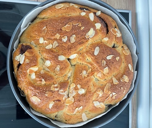 Продукти: 1 кг брашно, 2 пакетчета суха мая, 6 яйца, 200 г масло, 40 мл олио, 250 мл прясно мляко,250 г захар, 2 броя есенция ванилия, 1 чаена лъжичка ром, една щипка сол, кората от един лимон, кората от един портокал, крем от шамфастък, масло от шамфастък (може да се замени с краме), филирани бадеми.