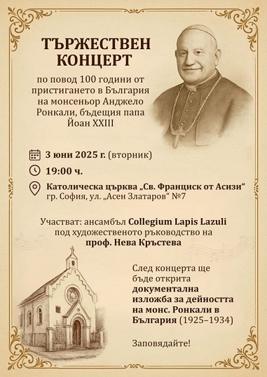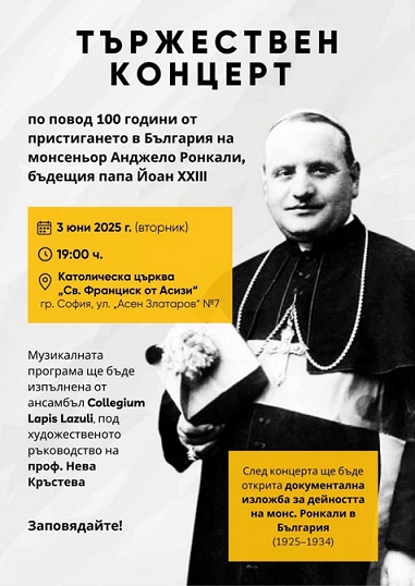 Тържествено честване ще се състои в София за 100-годишнината от пристигането на монсиньор Анджело Ронкали в нашата страна. Това е сетнешният папа Йоан XXIII, популярен още и като „българският папа“ заради топлите чувства, които храни към България.