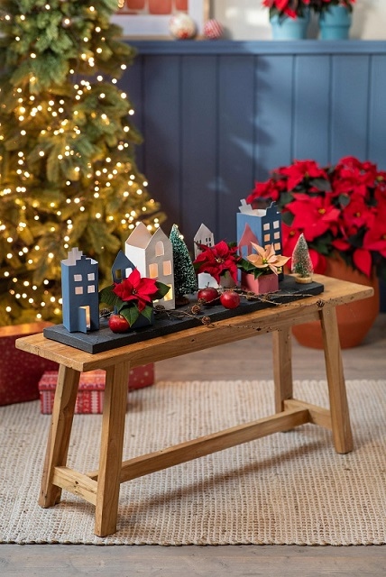 Стъпка 5: Подредете къщичките с поинсетии, тези за свещи, мини елхичките, ябълките и декоративните клонки върху дървената основа. При нужда фиксирайте с топъл силикон. Поставете LED свещите в затворените къщички.