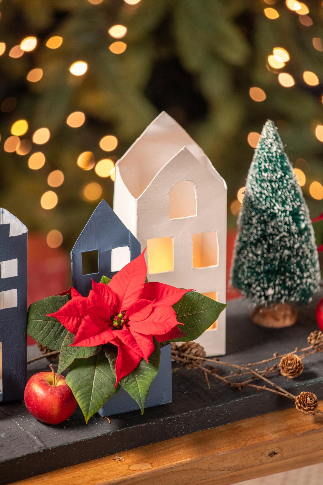 Това вълшебно коледно селце е креативна аранжировка, особено подходяща за семейства с деца. Ръчно изработени къщички от празни картонени опаковки (например от натурален сок) и яркочервени мини коледни звезди превръщат тази флорална композиция в празнична декорация, която радва както малки, така и големи.