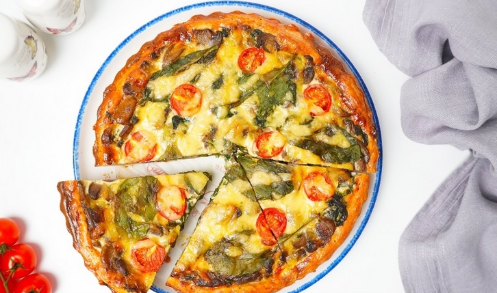 Продукти: маслено тесто – 500 г, гъби – 500 г, спанак – 300 г, пресен лук – 200 г, твърдо сирене тип кашкавалено /не бяло/ – 60 г, масло – 50 г, растително масло – 30 мл, сметана – 50 мл, чери домати – 6 бр., сол – 1 ч.л. или на вкус, черен пипер – 0,5 ч.л. или на вкус, яйце – 1 брой.
