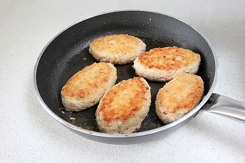 Оваляйте кюфтетата в галета, придавайки им по-плоска форма. Изсипете няколко супени лъжици растително масло в горещ тиган и ги запържете и от двете страни, докато леко покафенеят. След това покрийте с капак, намалете котлона и запържете още 10 минути. Сервирайте с гарнитура по ваш вкус.