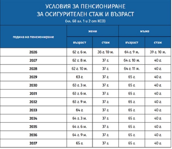 Според Кодекса за социално осигуряване (КСО), възрастта и осигурителният стаж за пенсия за осигурителен стаж и възраст се увеличават поетапно. Ето как се движат те в следващите години.