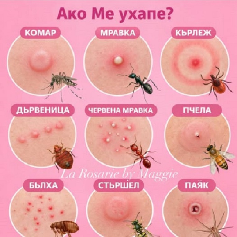 Червена (огнена) мравка – усещаш болка, група пъпки с бели връхчета. Измий веднага, сложи студен компрес и антиалергичен крем. Не пукай пъпките заради риск от инфекция.