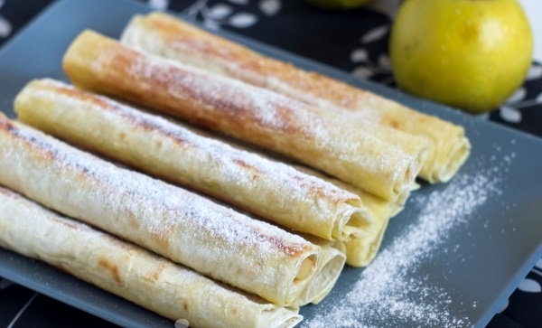 Приготвяне: Приготвяне на съставките. Измийте ябълките, обелете ги, отстранете сърцевината и семките и ги нарежете на малки кубчета. Оставете да къкрят в тенджера с 1-2 супени лъжици вода, покрити. Времето за готвене зависи от сорта ябълки. Резените трябва да омекнат, като същевременно запазят формата си. Отцедете излишния сок и оставете ябълките да се охладят леко. Нарежете лаваша на парчета, които лесно се навиват. Поставете от ябълките в редичка, поръчете с малтко канела, ядки и стафиди, а също и малко захар. Навийте на пурички. Изпържете ги в тиган, като ги поставите в тигана с отворения край надолу, за да се изпече тестото и да не се разгънат. Лавашът абсорбира добре олиото, така че не пестете. Пуричките трябва да са добре запечени и хрупкави. Обърнете ги и изпържете и от другата страна. Прехвърлете готовият десерт в плоска чиния, оставете да се охлади и поръсете обилно с пудра захар.